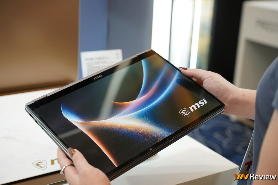 Cảm giác đầu tiên khi cầm Prestige 14 Flip AI+ là sự thay đổi đáng kể về trọng lượng so với người tiền nhiệm năm 2025. Với trọng lượng khoảng 1,3 kg, máy cho cảm giác cầm nắm rất vừa vặn, không quá nhẹ đến mức hụt hẫng nhưng đủ đầm tay để tạo cảm giác chắc chắn của một thiết bị cao cấp. MSI cho biết họ đã tái thiết kế hoàn toàn bộ khung máy để đạt được độ mỏng nhẹ này. Logo MSI cũng được làm mới tối giản, tinh tế hơn, tựa như một chữ ký viết tay, tạo nét mới lạ, phá cách.
