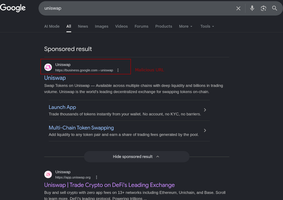Các quảng cáo độc hại trên Google đang bị lợi dụng để đánh cắp tiền điện tử bằng cách rút sạch ví và thu thập cụm từ hạt giống từ những người dùng đang tìm kiếm ứng dụng DeFi và dịch vụ ví hợp pháp.