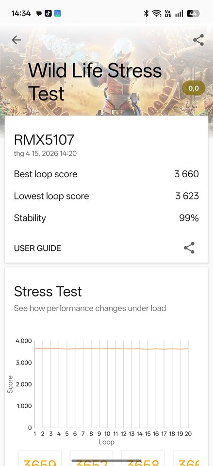 Kết quả benchmark của realme P4 Power 5G trong một số phần mềm benchmark AnTuTu, 3D Mark Wild Life Stress Test, GeekBench 6