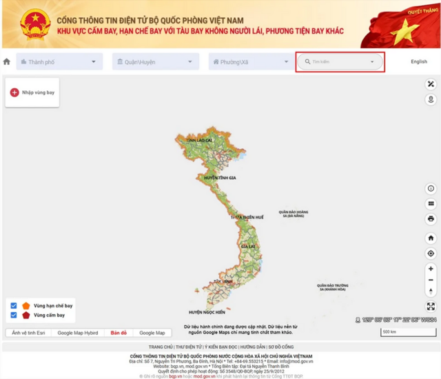 Người dùng có thể tra cứu thông tin vùng bay theo hai cách:- Tìm kiếm bằng từ khóa: Nhập tên địa điểm vào ô tìm kiếm, hệ thống sẽ tự động hiển thị thông tin bản đồ liên quan, bao gồm ranh giới hành chính, vùng cấm, và vùng hạn chế.