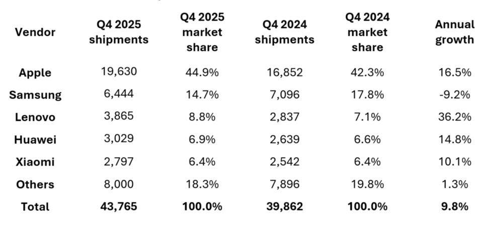 Theo số liệu mới nhất từ công ty nghiên cứu thị trường uy tín Omdia, quý IV/2025 đã chứng kiến một sự bùng nổ về doanh số máy tính bảng. Tuy nhiên, tâm điểm của sự tăng trưởng này lại tập trung gần như hoàn toàn vào hệ sinh thái của Apple. Cụ thể, trong ba tháng cuối năm, "Táo khuyết" đã xuất xưởng thành công 19,6 triệu chiếc iPad, chiếm lĩnh tới 44,9% thị phần toàn cầu. Con số này không chỉ khẳng định vị thế độc tôn mà còn cho thấy sức hút bền bỉ của dòng sản phẩm này đối với người tiêu dùng.