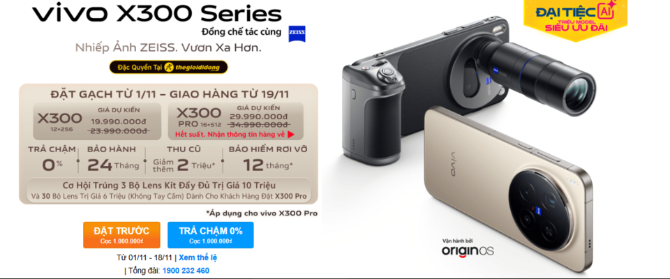 Người dùng khi tham gia chương trình đặt trước tại Thế Giới Di Động sẽ nhận được nhiều ưu đãi sẽ nhận ưu đãi lên đến 5 triệu đồng, trả chậm 0%, bảo hành chính hãng 24 tháng, bảo hiểm rơi vỡ màn hình 12 tháng (áp dụng cho vivo X300 Pro), thu cũ đổi mới, hỗ trợ 2 triệu đồng (áp dụng tùy sản phẩm thu cũ). Đặc biệt khi đặt trước X300 Pro, khách hàng may mắn có cơ hội trúng bộ quà tặng phiên bản giới hạn ống kính tăng cường tiêu cự Tele vivo ZEISS 2.35x.