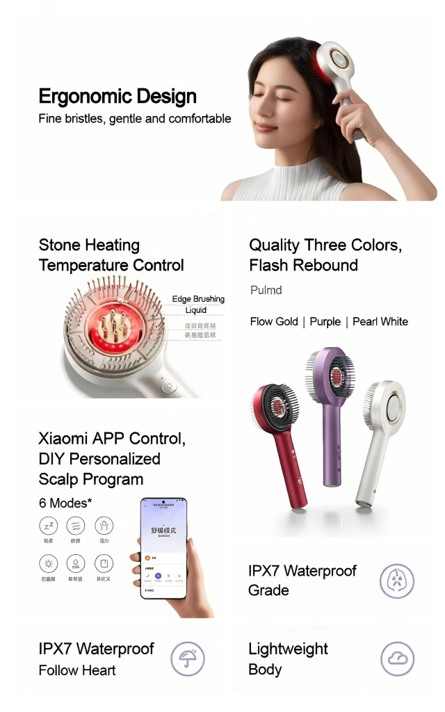 Theo Xiaomi, lược massage thông minh có tên Mijia Smart Head Massage Comb được thiết kế để mô phỏng cảm giác của một liệu pháp massage chuyên nghiệp, kết hợp kích thích da đầu thông minh với điều khiển bằng ứng dụng, mang đến những khả năng thư giãn và chăm sóc tóc mới cho thói quen hàng ngày.
