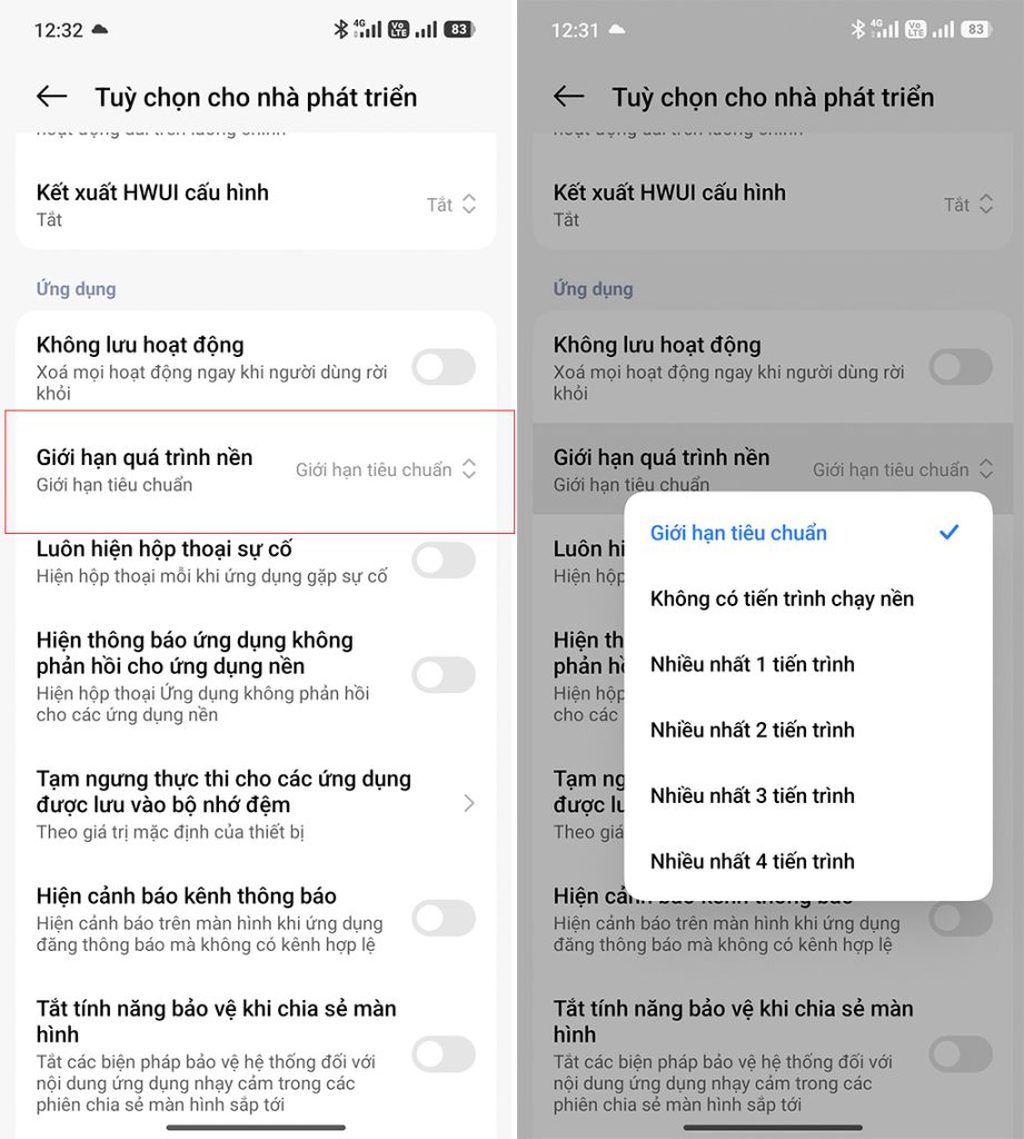 - Đặt thành “Không có tiến trình chạy nền” hoặc số thấp phù hợp với RAM của thiết bị.