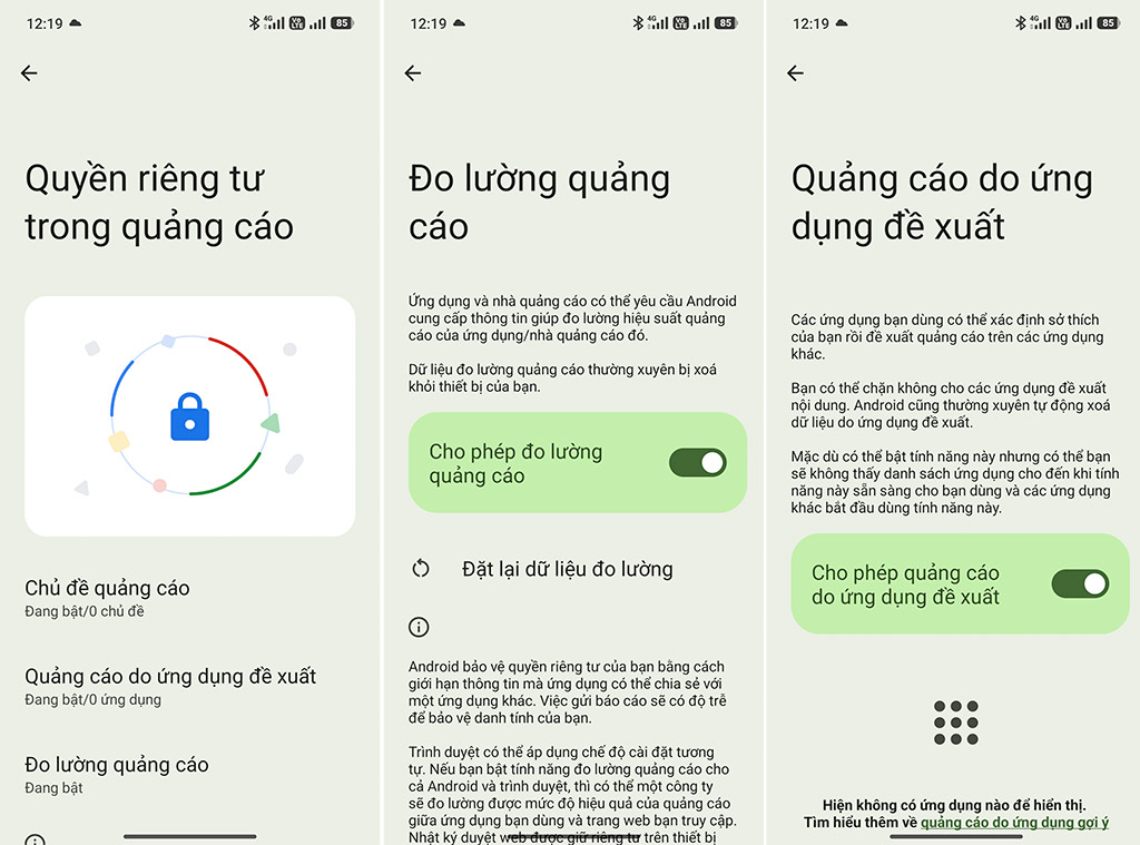 Để tắt quảng cáo hệ thống: Truy cập Cài đặt > Bảo mật và quyền riêng tư > Chế độ kiểm soát quyền riêng tư -> Quảng cáo -> Quyền riêng tư trong quảng cáo, tắt các tùy chọn trong 3 mục: Chủ đề quảng cáo, Quảng cáo do ứng dụng đề xuất, và Đo lường quảng cáo.
