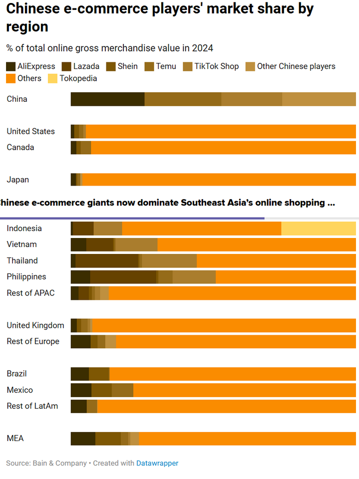 Theo báo cáo của Bain and Company, tại Indonesia, Thái Lan và Philippines, các công ty mua sắm trực tuyến Trung Quốc — chẳng hạn như Shein và Temu của PDD — chiếm khoảng 50% thị trường thương mại điện tử địa phương. Báo cáo cho thấy các công ty Trung Quốc cũng đã có được chỗ đứng trên thị trường thương mại điện tử đang phát triển tại các quốc gia từ Mỹ đến Brazil.