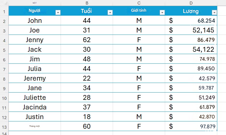 Giả sử bạn có bảng Excel chứa tên, tuổi và mức lương của 12 người và bạn được yêu cầu tính mức lương trung bình của những người trên 40 tuổi.