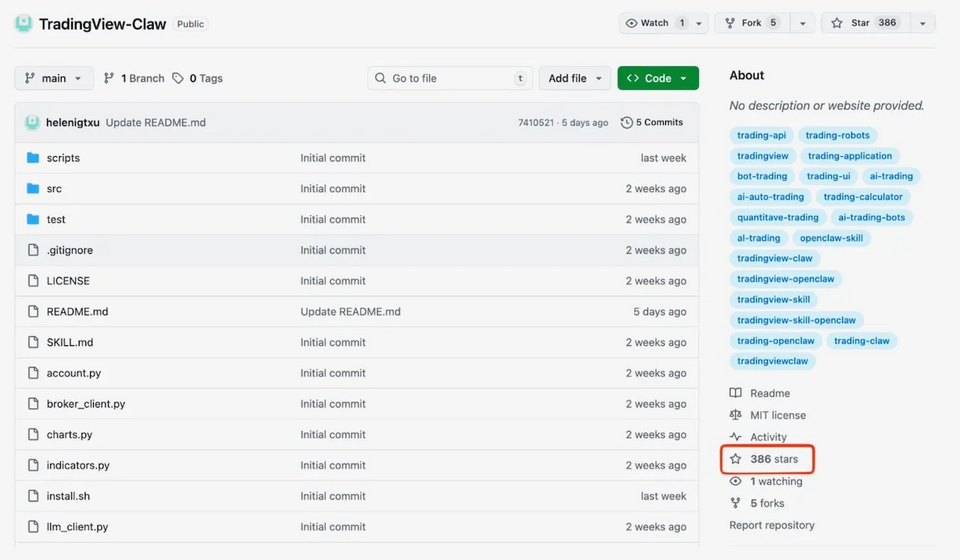 Kho lưu trữ TradingView-Claw, hiển thị 386 sao (Nguồn: JFrog).