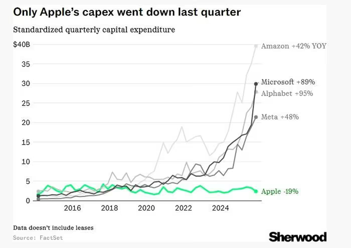 Apple là công ty duy nhất trong nhóm Big Tech ghi nhận chi phí vốn giảm. Nguồn: Sherwood