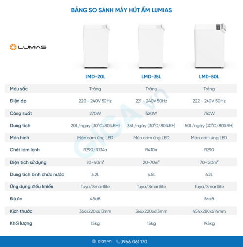 Dòng máy hút ẩm Lumias LMD Series cũng có 3 sản phẩm với công suất hút ẩm khác nhau: Lumias LMD-20L hút ẩm cho diện tích tới 40 m2, Lumias LMD-35L hút ẩm cho diện tích tới 70m2 và Lumias LMD-50L hút ẩm cho diện tích lớn tới 120m2.
