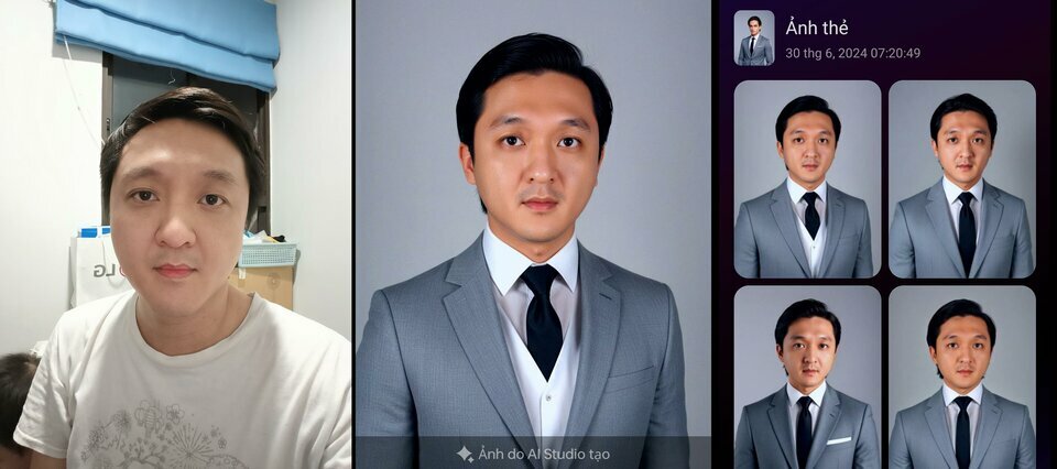 Thử nhanh tính năng tạo ảnh AI Studio trên Oppo Reno12 Series, ngoài cùng bên trái là ảnh gốc do mình tự chụp, các ảnh sau là do AI tạo ra theo phong cách Ảnh thẻ chủ tịch