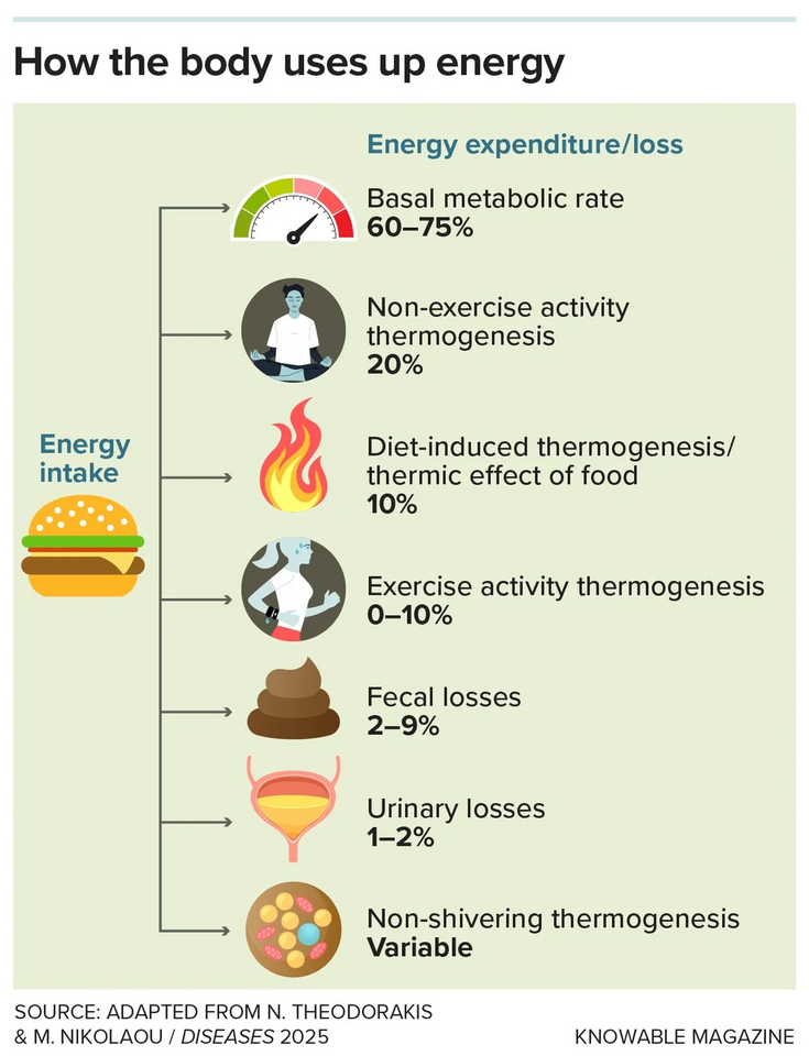 Ngoài ra, những người gầy bẩm sinh dường như không tăng cân bền vững khi ăn chế độ nhiều chất béo. Một số nghiên cứu cho thấy họ có xu hướng đốt cháy hoặc “lãng phí” nhiều calo hơn: họ có thể cựa quậy nhiều hơn, chuyển hóa mạnh hơn hoặc bài tiết một phần đáng kể năng lượng qua phân và nước tiểu. Một số người có thể thải ra đến 10% lượng calo ăn vào — cao hơn nhiều so với mức trung bình.
