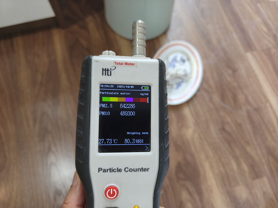 Mình đã làm một thử nghiệm thực tế tương đối khắc nghiệt: đốt 10 cây nhang trong căn phòng 15 mét vuông đóng kín. Có thể bạn đã biết, khói thuốc hay khói nhang tạo ra rất nhiều bụi mịn. Sau khi đốt hết 10 cây nhang, mình dùng thiết bị đo bụi chuyên dụng thì thấy nồng độ bụi mịn PM2.5 và PM10 trong phòng tăng lên hàng nghìn lần so với ngưỡng an toàn.