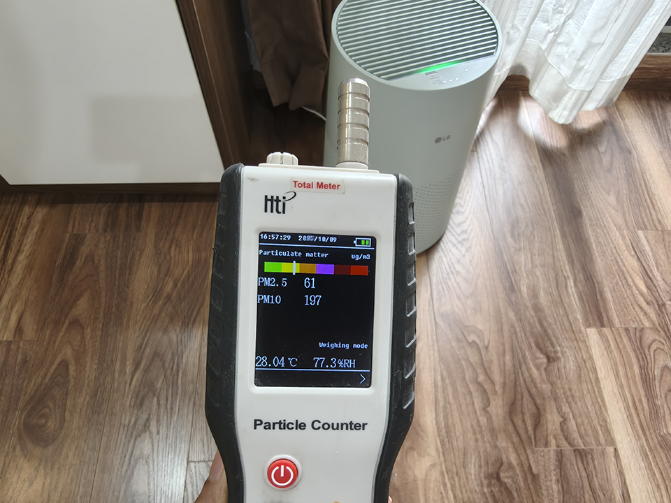 Sau 30 phút bật máy lọc khí ở tốc độ cao, chỉ số bụi mịn PM2.5 và PM10 giảm nhanh, tương ứng còn 61 µm/m3 và 197 µm/m3, vẫn ở mức ô nhiễm nhẹ. Sau 1 giờ lọc thì cả hai chỉ số này đều giảm xuống rất thấp về ngưỡng sạch: PM2.5 chỉ còn 2 µm/m3 và PM10 là 7 µm/m3.
