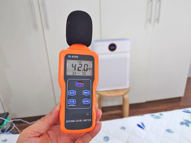 Về độ ồn, máy lọc khí này phát ra độ ồn tùy theo tốc độ gió. Mức gió thấp thì độ ồn rất nhỏ, chỉ 33 dB; còn mức gió trung bình thì ồn tăng lên 42 dB, vẫn ở ngưỡng không gây khó chịu; còn tốc độ gió cao nhất thì độ ồn khá to tới 56 dB. Trong quá trình sử dụng thực tế, máy thường chạy ở tốc độ gió cao nhất trong thời gian ngắn lúc mới lọc, còn hầu hết thời gian sẽ chạy ở tốc độ thấp hoặc trung bình.